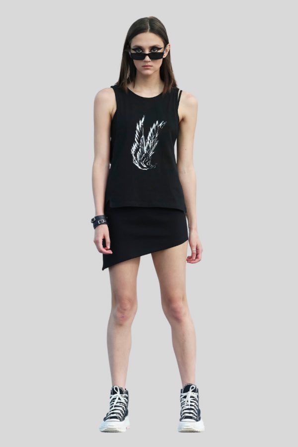 Летний вариант дизайнерского лука – максимально открытые вещи. Топ без рукавов, с разными бретельками или с асимметрией позволит вам показать плечи и живот, а также значительно подчеркнёт фигуру.